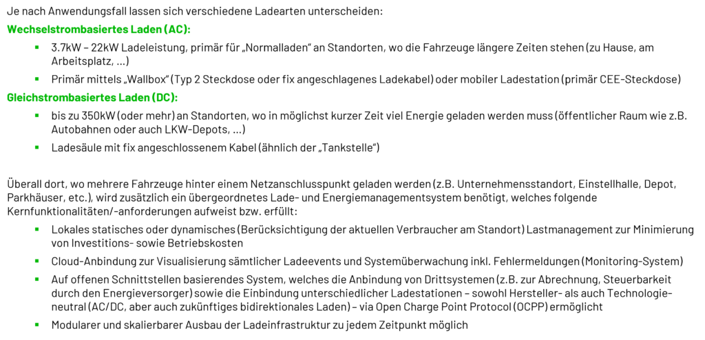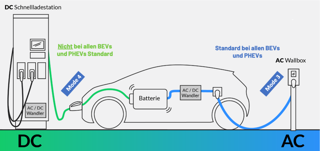 Elektrofahrzeuge können prinzipiell mit Ein- bis Dreiphasen-Wechselstrom „alternating current“ (AC) oder mit Gleichstrom „direct current“ (DC) geladen werden. Beim AC-Laden übernimmt ein im Fahrzeug eingebauter Gleichrichter die Stromwandlung aus dem öffentlichen Wechselstromnetz in den von der Batterie benötigten Gleichstrom; beim DC-Laden erfolgt die Laderegelung in der Ladestation.