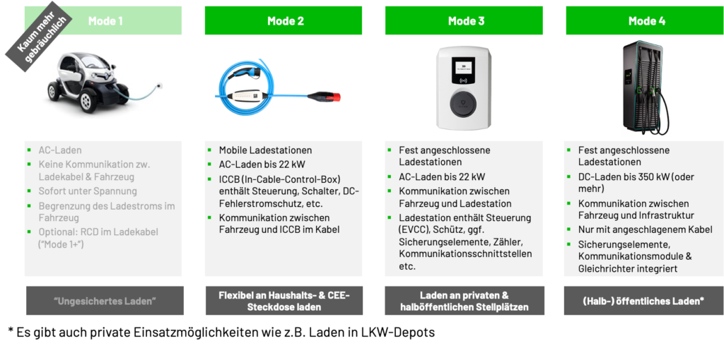 Gemäss Norm IEC 61851-1 werden vier Lademodi der Elektromobilität unterschieden. Während die Lademodi 1 bis 3 auf Wechselstrom-Technik (AC) basieren, kommt bei Mode 4 die Gleichstrom-Technologie (DC) zur Anwendung. Lademodus 1 ist heute kaum mehr gebräuchlich (deshalb wird an dieser Stelle nicht weiter auf Lademodus 1 eingegangen).