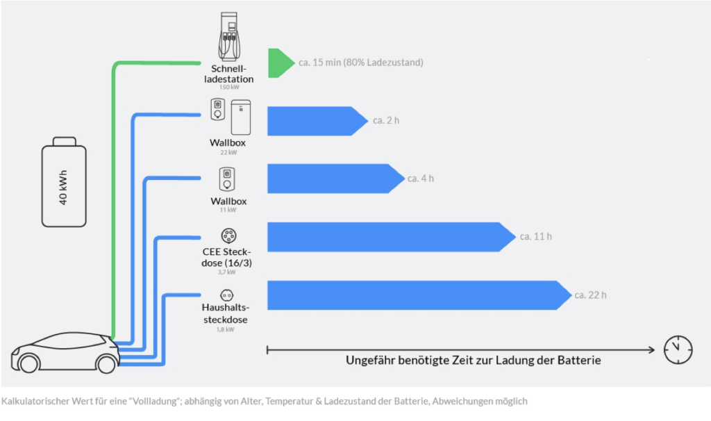 In Abhängigkeit der verschiedenen Ladearten/Lademodi ergeben sich unterschiedliche, rein kalkulatorische Ladezeiten – welche lediglich als Indikation zu betrachten sind – in Bezug auf eine Vollladung der Batterie. Dabei ist zu beachten, dass die Ladezeiten nicht nur von der verfügbaren Ladeleistung der Ladeinfrastruktur abhängig sind, sondern auch von der Ladeleistung, welche das Fahrzeug aufnehmen kann.