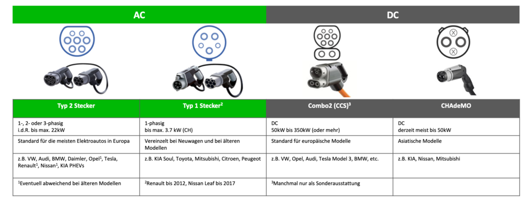 Die Ladeanschlüsse von Elektroautos unterscheiden sich je nach Hersteller, Modell und Baujahr. Für das AC-Laden hat sich europaweit der Steckerstandard Typ 2 etabliert, für das DC-Laden der CCS-Standard. Auch der japanische DC-Schnellladestandard CHAdeMO, der vor allem bei asiatischen Fahrzeugmodellen gebräuchlich ist, wird an den meisten öffentlichen Ladestationen (noch) angeboten.