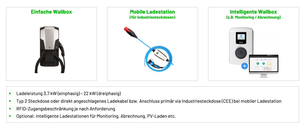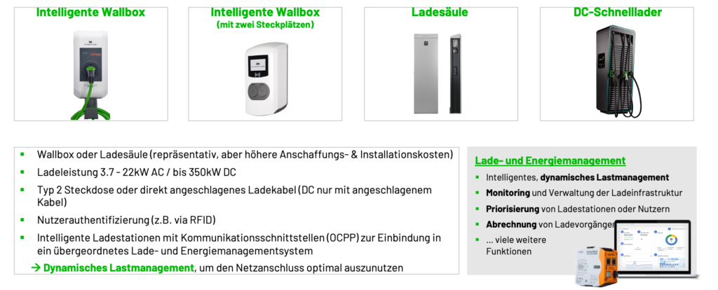 Für Firmenparkplätze, Einstellhallen, Hotels, etc. bieten sich ganzzeitliche Ladelösungen inkl. intelligenter Wallboxen oder Ladesäulen an – Diese werden mit einem übergeordneten Lade- und Energiemanagementsystem kombiniert, welches u.a. Lastmanagement sicherstellt