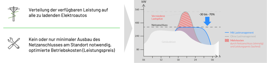 Um eine Überschreitung der Netzanschlussleistung respektive des Leistungslimits für Ladeinfrastruktur zu verhindern, reduziert ein Lade- und Energiemanagementsystem mit lokaler Lastmanagement-Funktion (ein solches wird von den Energieversorgern/Netzbetreibern ab zwei oder mehreren Ladepunkten hinter einem Netzanschlusspunkt gefordert) die Ladeleistung der angeschlossenen Ladepunkte teilweise oder gänzlich. Durch die Reduzierung der Ladeleistung können Ladevorgänge verlangsamt oder pausiert werden. Bei Unterbrechung startet das System die Ladevorgänge erneut, sobald wieder ausreichend Leistung zur Verfügung steht. Zudem passt es die Leistungsangebote an die Ladestationen anhand der zur Verfügung stehenden Leistung und des tatsächlich geladenen Stromes an. Durch die Begrenzung der Netzanschlussleistung wird sichergestellt, dass einerseits keine oder nur minimale Investitionskosten in den Netzausbau anfallen, andererseits die Betriebskosten (Leistungspreise, sofern anfallend) optimiert werden.