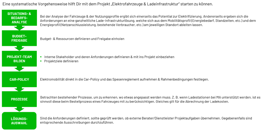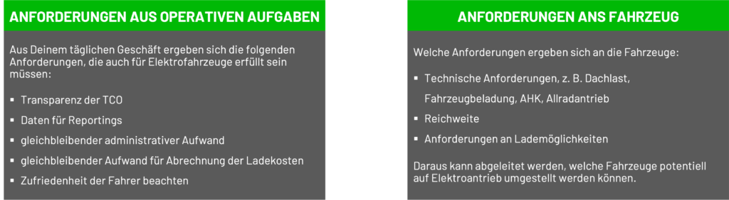 Die Umstellung auf Elektrofahrzeuge bringt einige Änderungen mit sich. Bei Deiner Bedarfsanalyse geht es um zwei Haupt-Themenblöcke: