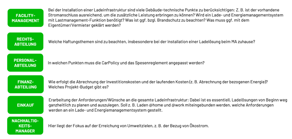 Hier findest Du die Details, welche Fragen mit den jeweiligen Abteilungen für die Installation einer Ladeinfrastruktur geklärt werden müssen: