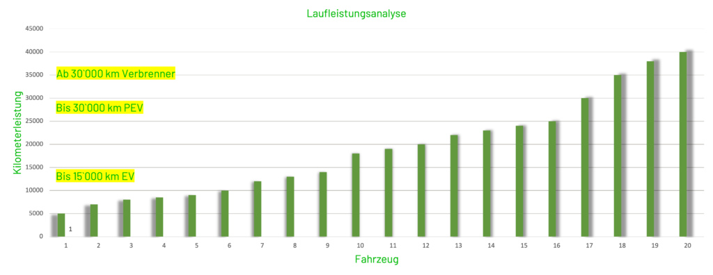 Bei der Auswertung muss unterschieden werden, ob das Fahrzeug einem Fahrer fest zugeordnet ist, ob das Fahrzeug beispielsweise ein Motivationsfahrzeug ist und auch die Privatnutzung eine Rolle spielt. In diesem Fall muss überlegt werden, ob dem Fahrer gegebenenfalls für den geringen Anteil an längeren Fahrstrecken ein alternatives Fahrzeug zum Beispiel aus dem Fahrzeugpool zur Verfügung gestellt werden kann. Diese Überlegungen sind Teil der Mobilitätsstrategie eines Unternehmens und wird in der Car Policy geregelt.