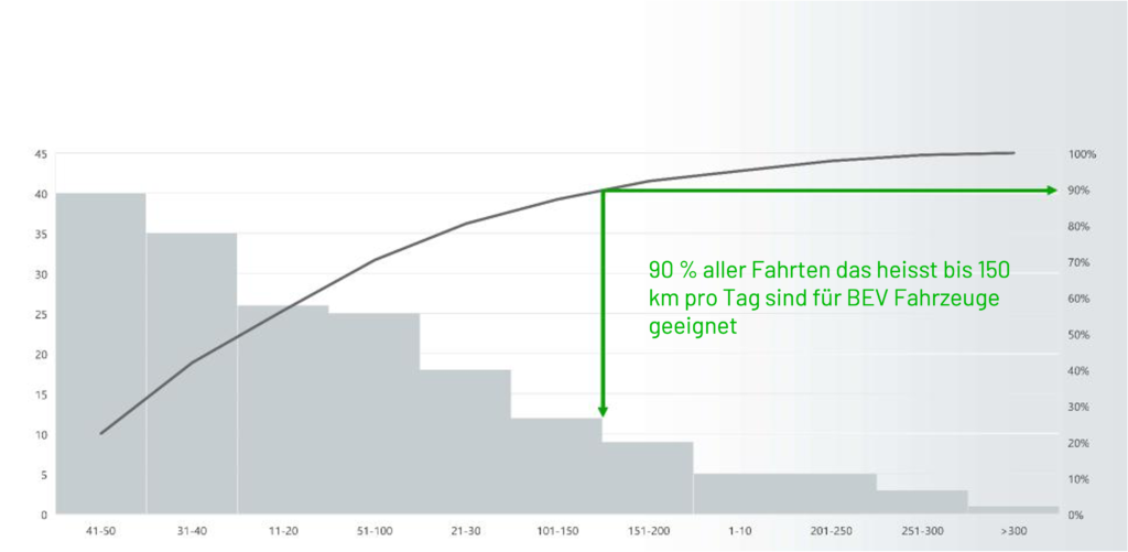 Die Streckenprofilanalyse zeigt auf, wie gross der Anteil der einzelnen Fahrstrecken eines Fahrzeugs in einem definierten Zeitraum ist. Daraus lässt sich ableiten, wie viele der Strecken mit einem batterieelektrischen Antrieb zurückgelegt werden können. Diese Auswertung kann sowohl auf Einzelfahrzeugebene als auch auf Teilfahrzeugparkebene durchgeführt werden.