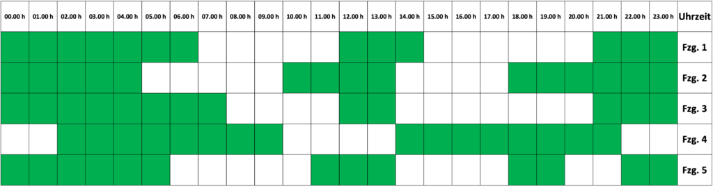 Standzeitenanalyse zeigt auf, zu welchen Zeiten das Fahrzeug am Standort oder im Bereich einer geeigneten Ladeinfrastruktur steht und geladen werden könnte. Wichtig hierbei ist, dass es sich nicht nur um die Darstellung von Fahrtzeiten handelt. Vielmehr geht es darum, dass das Fahrzeug während dieser Zeit nicht im Bereich einer geeigneten Ladeinfrastruktur ist (dargestellt durch die grünen Bereiche dieser Darstellung). Ob es dabei fährt oder nicht spielt keine Rolle. Die Ladeinfrastruktur kann im Betrieb, öffentlichem Netz oder auch Zuhause sein. Die Daten können einzeln oder auch im sogenannten Poolbetrieb erhoben werden. Dadurch wird eruiert wie viele Fahrzeuge im Poolbetrieb notwendig sein werden.