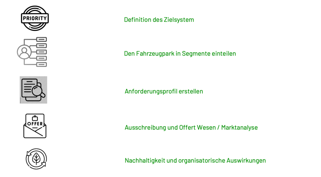 Sobald bestimmt wurde , welche Fahrzeuggruppen oder welche Teilfahrzeugparks für den Einsatz von BEV oder PHEV in Frage kommen, muss im nächsten Schritt das Marktangebot analysiert werden. Dabei wird ein Fahrzeugprofil erstellt, dass man in einer Ausschreibung den Fahrzeugimporteuren zur Verfügung stellen kann.