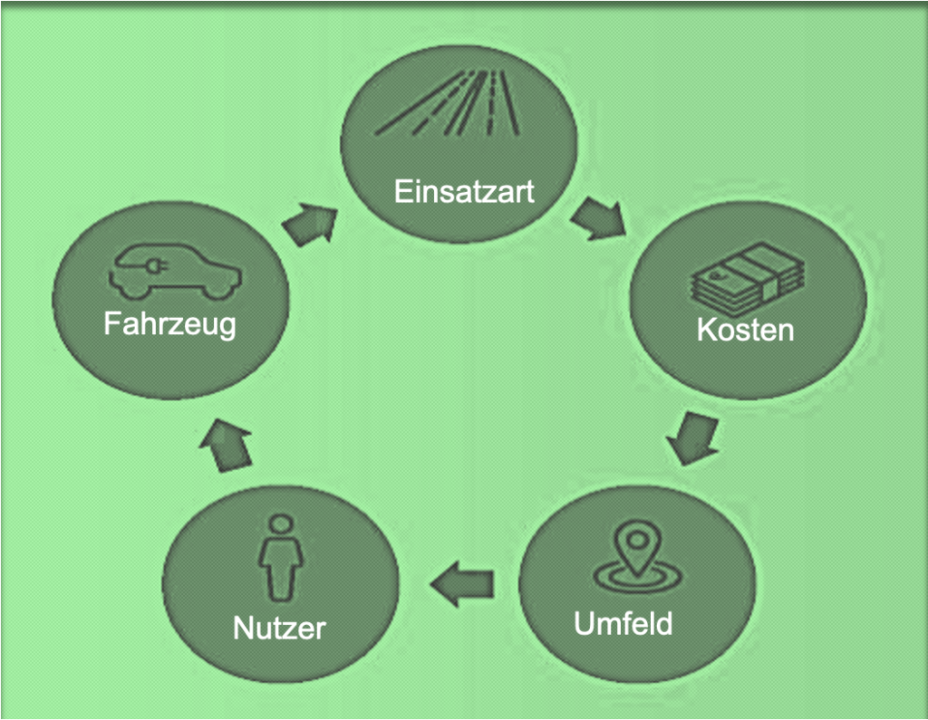 Zunächst ist es wichtig, eine Priorisierung der Ziele vorzunehmen, die mit der Einführung von E-Autos erreicht werden sollen. Die Rolle der Nutzerschaft und insbesondere seine Anforderungen und Wünsche ist in einer geplanten Umstellung ein nicht zu unterschätzender Faktor. Welche Gewichtung haben Kostenaspekte und wie wichtig sind ökologische Aspekte. Es wird nicht immer gelingen, allen Anforderungen und Wünsche gleichzeitig und in gleichem Maß gerecht zu werden. Kompromisse werden notwendig sein. Auf der anderen Seite ergeben sich Vorteile oder Vereinfachungen, die mit den bisherigen Verbrennerfahrzeugen nicht möglich waren. Hier sollte eine Gegenüberstellung gemacht werden, um entscheiden zu können, wo gegebenenfalls Einschränkungen möglich und Änderungen nötig sein werden.