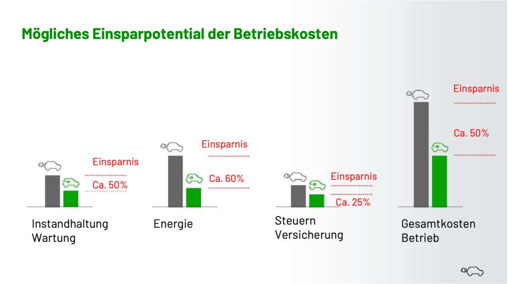 Die Betriebskosten können sich mit dem Einsatz von E-Fahrzeugen deutlich reduzieren. Fahrzeugverantwortliche, die bereits >100 Elektrofahrzeuge im Einsatz haben, berichten von einer Halbierung der Betriebskosten, sofern Serienfahrzeuge im Einsatz sind.